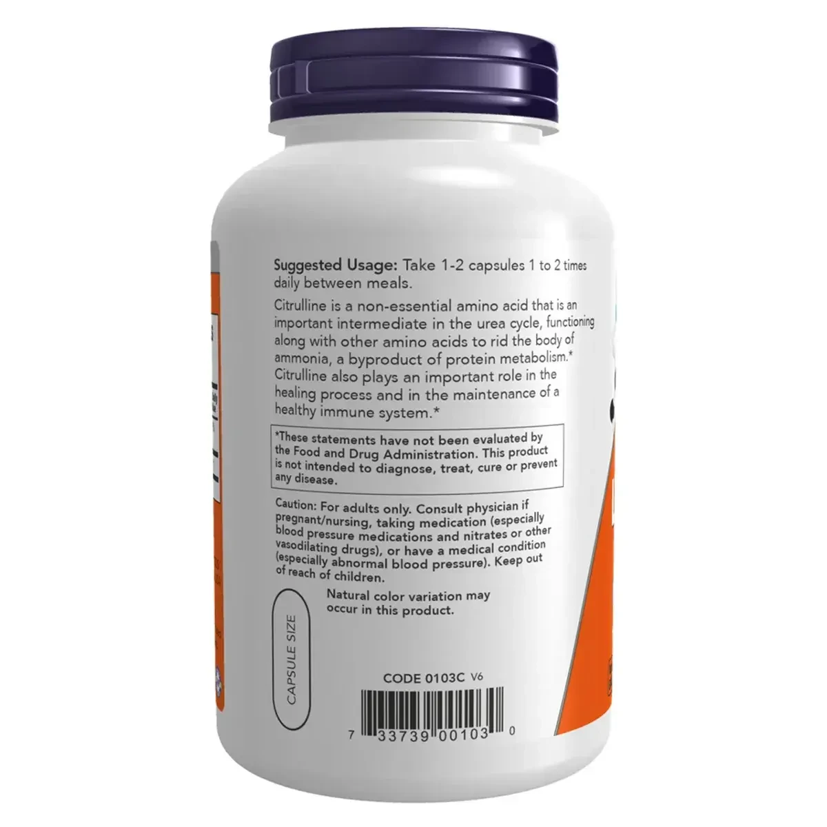 NOW Citrulline 750mg VegeCapsules support protein metabolism and immune system health. Non-GMO and vegan-friendly, ideal for daily wellness. Features Supports protein metabolism Healthy immune system function Non-GMO Vegetarian/Vegan Free from common allergens L-Citrulline, Hypromellose (Cellulose Capsule), Stearic Acid (Vegetable Source), Silicon Dioxide.NOW Citrulline 750mg VegeCapsules support protein metabolism and immune system health. Non-GMO and vegan-friendly, ideal for daily wellness.Take 1-2 Capsules 1 To 2 Times Daily Between Meals.For Adults Only. Consult Physician If Pregnant/Nursing, Taking Medication (Especially Blood Pressure Medications And Nitrates Or Other Vasodilating Drugs), Or Have A Medical Condition (Especially Abnormal Blood Pressure). Keep Out Of Reach Of Children.
