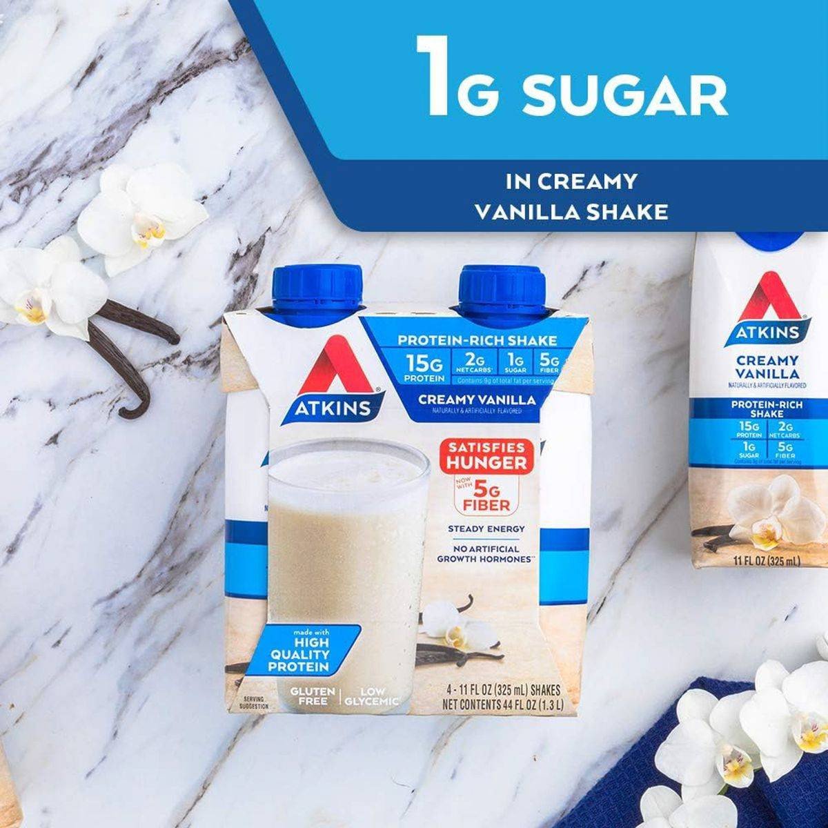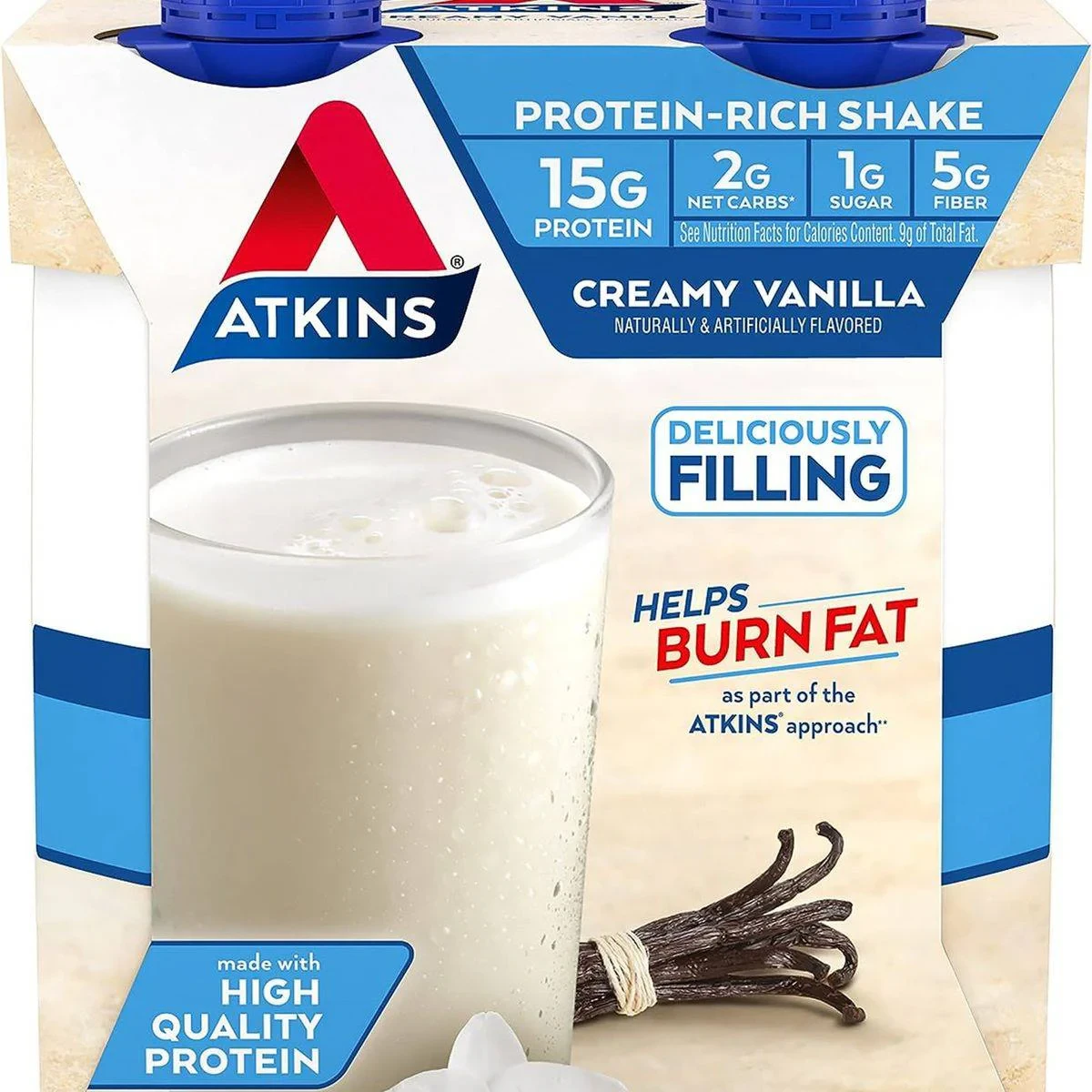 Atkins Protein Rich Shake is a creamy vanilla flavored drink with 15g of protein, 1g of sugar, and 2g of net carbs per serving. Ideal for keto diets and on-the-go nutrition. Features High quality protein Low glycemic Gluten free 1g sugar per serving 15g protein per serving 2g net carbs per serving No artificial growth hormones Good source of fiber Keto friendly Deliciously filling Water, Milk Protein Concentrate, Soy Protein Isolate, Sunflower Oil, Prebiotic Soluble Corn Fiber, Cream, Contains Less than 1% of Natural and Artificial Flavors, Cellulose Gel, Magnesium Phosphate, Potassium Citrate, Dipotassium Phosphate, Tricalcium Phosphate, Salt, Cellulose Gum, Sucralose, Soy Lecithin, Carrageenan, Acesulfame Potassium, Sodium Ascorbate (Vitamin C), Zinc Gluconate, DL-Alpha-Tocopheryl Acetate (Vitamin E), Manganese Gluconate, Niacinamide (Vitamin B3), Phytonadione (Vitamin K), Cholecalciferol (Vitamin D3), D-Calcium Pantothenate (Vitamin B5), Sodium Selenite, Sodium Molybdate, Chromium Chloride, Biotin (Vitamin B7), Cyanocobalamin (Vitamin B12), Folic Acid (Vitamin B9), Pyridoxine Hydrochloride (Vitamin B6), Potassium Iodide, Thiamin Hydrochloride (Vitamin B), Riboflavin (Vitamin B2).Atkins specializes in low-carb, high-protein products for health-conscious consumers.Shake well and enjoy chilledSee Nutrition Facts for Calories Content.