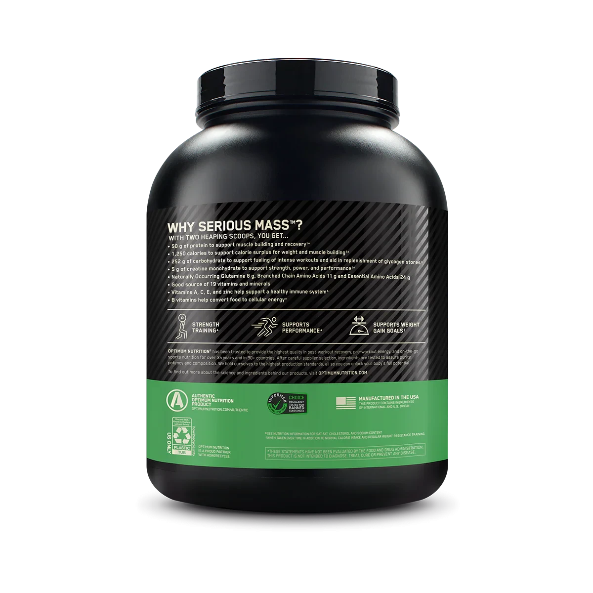 Optimum Nutrition Serious Mass is a high-calorie weight gainer which is also high in protein and when taken over time with regular resistance exercise and a balanced diet can help you gain mass and muscle. It also has creatine and glutamine to support Muscle building & recovery, when accompanied by a balanced diet and regular exercise. Maltodextrin, Protein Blend (Whey Protein Concentrate, Calcium Caseinate, Egg Albumin, Sweet Dairy Whey), Artificial Flavors, Vitamin and Mineral Blend (DiPotassium Phosphate, Magnesium Aspartate, DiCalcium Phosphate, Calcium Citrate, Ascorbic Acid, Niacinamide, Zinc Citrate, Beta Carotene, D-Calcium Pantothenate, D-Alpha Tocopheryl Succinate, Selenomethionine, Copper Gluconate, Ferrous Fumarate, Manganese Amino Acid Chelate, Thiamin Mononitrate, Pyridoxine Hydrochloride, Riboflavin, Chromium Polynicotinate, Folic Acid, Biotin, Molybdenum Amino Acid Chelate, Cholecalciferol, Potassium Iodide, Cyanocobalamin), Medium Chain Triglycerides, Lecithin, Acesulfame Potassium.Optimum Nutrition Serious Mass is a high-calorie weight gainer which is also high in protein and when taken over time with regular resistance exercise and a balanced diet can help you gain mass and muscle. It also has creatine and glutamine to support Muscle building & recovery, when accompanied by a balanced diet and regular exercise.Add 1 scoop of Serious Mass powder in 350ml water or juice and have it twice a day. Prepare using an electric blender. Add fresh or frozen fruits, peanut butter, nuts & other calorie-dense foods to boost your weight gain potential, Use post-workout and/or between meals to add calories, carbs, and protein to your healthy, balanced diet. Serious Mass is a substantial weight-gain supplement that can be used to feed serious calorie needs in a variety of different ways. Between Meals: Drink 1/2-1 serving of Serious Mass Weight Gainer between meals to maintain positive nitrogen balance and support a high-calorie diet. Post-Workout: Begin drinking 1/2-1 serving of Serious Mass 30-45 minutes following exercise to support maximum recovery. Before Bed: Drink 1/2-1 serving of Serious Mass about 45-60 minutes before bed to provide nutrients to recovering muscle throughout the night.Keep out of reach of children. Do not take this product if you are pregnant or nursing a baby. Check with a qualified healthcare professional before using this product if you are under 18 years of age or if you have any known or suspected medical condition(s) including diabetes, hypoglycemia, and/or if you are taking any prescription or OTC medication(s).