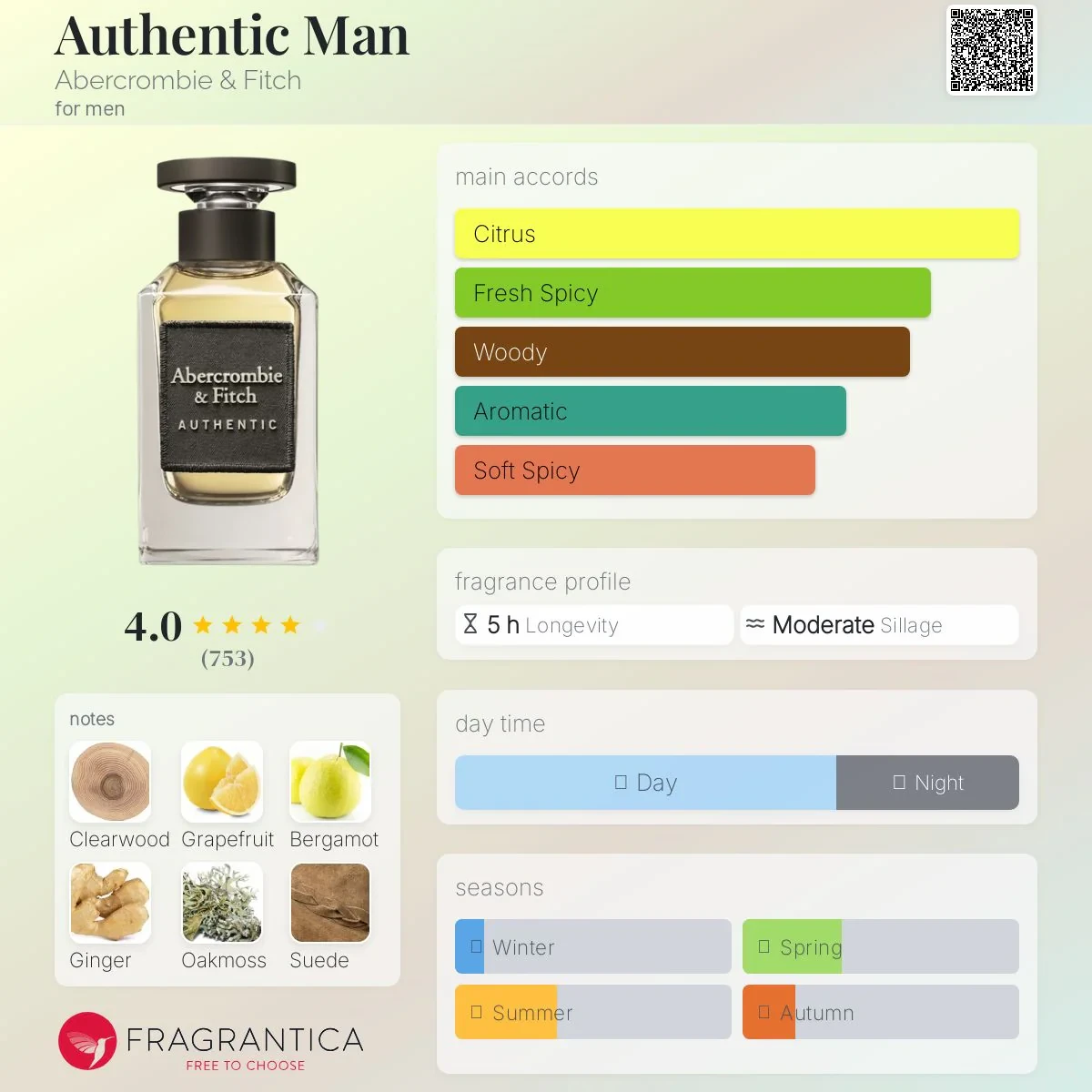 Abercrombie & Fitch Authentic Man EDT is a citrus aromatic fragrance with notes of grapefruit, bergamot, and clearwood. Ideal for casual wear, it offers long-lasting freshness. Features Citrus aromatic fragrance Notes of grapefruit, bergamot, pink pepper Includes ginger, sage, lavender Contains clearwood, moss, suede Recommended for casual wear Long-lasting freshness 3.4 Fl Oz size Good value for money Grapefruit, Bergamot, Pink Pepper, Ginger, Sage, Lavender, Clearwood, Moss, Suede.Abercrombie & Fitch Authentic Man EDT is a citrus aromatic fragrance with notes of grapefruit, bergamot, and clearwood. Ideal for casual wear, it offers long-lasting freshness.