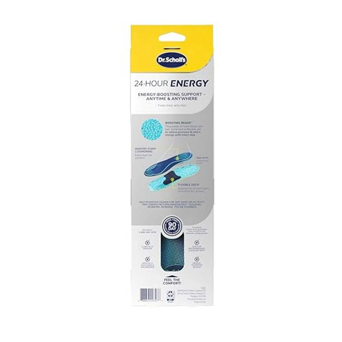 Dr. Scholl's 24-Hour Energy Multipurpose Insoles are designed for those who want to move more. They relieve tired, achy feet and muscle soreness by distributing pressure and returning energy with every step. Featuring Boosting Beads technology, memory foam, and flexible gel, they provide comfort and support for walking, running, and daily activities. Clinically proven to reduce fatigue and provide long-lasting comfort. Features Energy Boosting Bead Technology Memory Foam Cushioning Flexible Arch Support Relieves Pressure and Returns Energy Suitable for Various Shoe Types Key Materials: Proprietary Massaging Gel compound (Thermoplastic Elastomer/Polymer), Fabric top cloth (Polyester/Nylon), Designed for cushioning and shock absorption.Dr Scholls: Innovators in foot care solutions, known for comfort and support products.Remove existing insoles if possible. Trim Dr. Scholl’s insoles to fit your shoe size. Place insoles with cloth side up, heel resting firmly in the shoe.Warning: If You Have Diabetes, Poor Blood Circulation, Or Fragile Skin, Consult Your Doctor Before Use. If Foot Pain Persists Or Worsens, Discontinue Use And Consult A Physician.