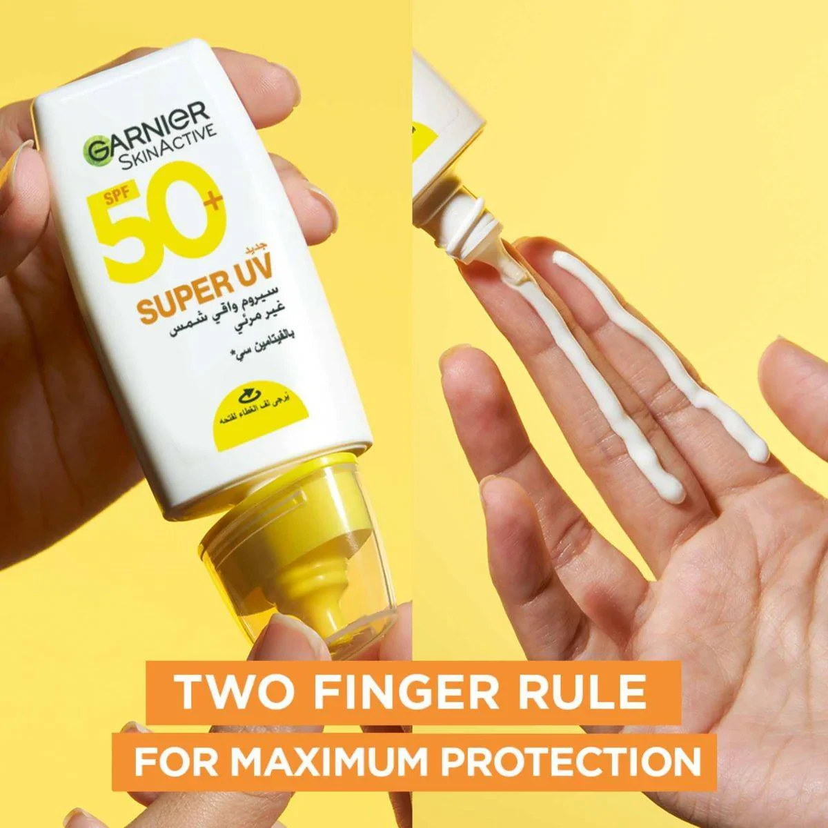Garnier SkinActive Super UV Invisible Serum Sunscreen SPF 50+ offers high UV protection against UVA, UVB, and long UVA rays. Enriched with Vitamin C, it is lightweight, non-comedogenic, and leaves no residue or white cast. Ideal for daily use to protect the skin from sun damage and premature aging. Features