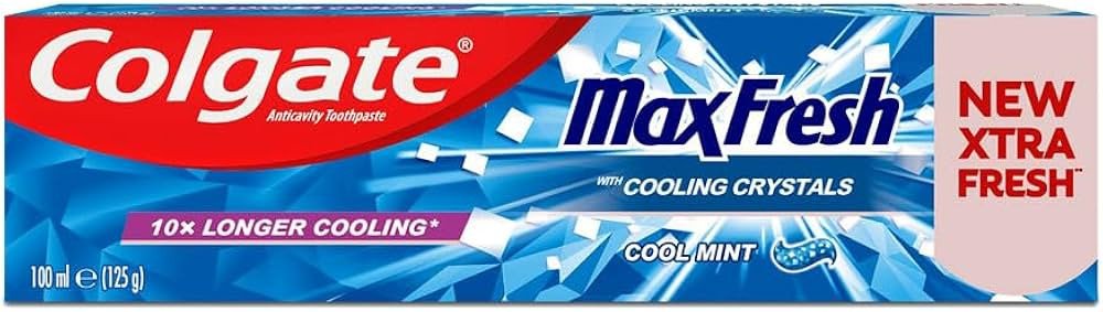 Colgate Max Fresh Cool Mint Toothpaste invigorates your brushing experience with its unique formula packed with mini breath strips. It offers long-lasting fresh breath and cavity protection. Features With breath strips Freshness lasts for hours Fluoride toothpaste to fight cavities Whitens teeth by removing surface stains Sugar-free, gluten-free Cool Mint flavor Sodium Fluoride 0.24% (0.14% w/v fluoride ion), Sorbitol, Water, Hydrated Silica, Sodium Lauryl Sulfate, Flavor, PEG-12, Cellulose Gum, Glycerin, Cocamidopropyl Betaine, Sodium Saccharin, Hydroxypropyl Methylcellulose, Blue 1, Titanium Dioxide.Colgate: A trusted leader in oral care, known for innovative toothpaste solutions and fresh breath technology.Adults and children 2 years and older: Brush teeth thoroughly, preferably after each meal or at least twice a day, or as directed by a dentist or physician.Keep out of reach of children under 6 years of age. If more than used for brushing is accidentally swallowed, get medical help or contact a Poison Control Center right away.