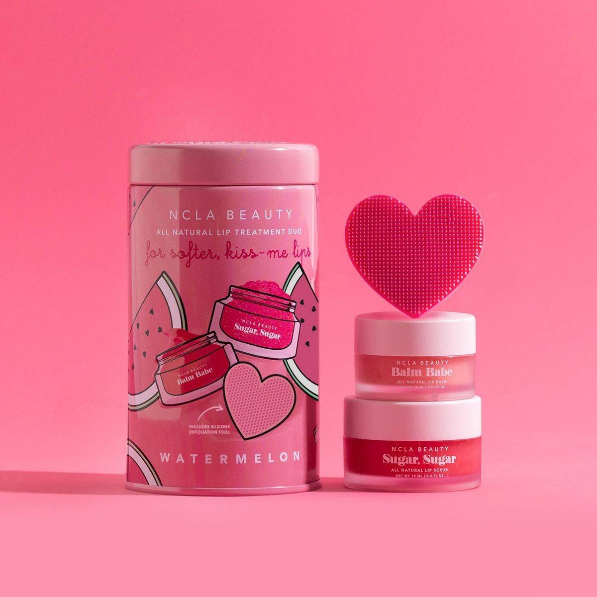 The NCLA Beauty Lip Care Duo + Lip Scrubber Set in Watermelon offers a complete lip treatment. The Sugar Sugar lip scrub gently exfoliates and hydrates, while the Balm Babe lip balm nourishes and smooths. Includes a silicone lip scrubber for enhanced exfoliation. Perfect for achieving soft, kissable lips. Features