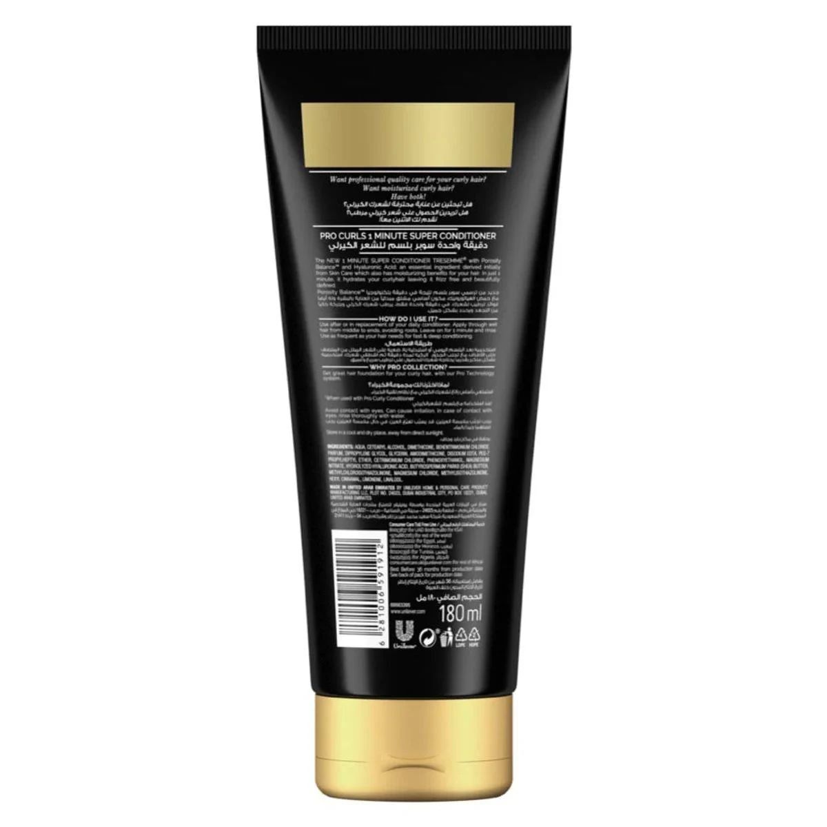 Aqua, Cetearyl Alcohol, Dimethicone, Behentrimonium Chloride, Parfum, Dipropylene Glycol, Glycerin, Amodimethicone, Disodium Edta, Peg-7 Propylheptyl Ether, Cetrimonium Chloride, Phenoxyethanol, Magnesium Nitrate, Hydrolyzed Hyaluronic Acid, Butyrospermum Parkii (Shea) Butter, Methylchloroisothiazolinone, Magnesium Chloride, Methylisothiazolinone, Hexyl Cinnamal, Limonene, Linalool.TRESemmé Pro Curls 1 Minute Super Conditioner hydrates and defines curls with Porosity Balance and Hyaluronic Acid. Ideal for dry, curly hair.Apply Through Wet Hair From Middle To Ends, Leave In For 1 Minute, Then Rinse.Avoid Contact With Eyes. Can Cause Irritation; If Contact Occurs, Rinse Thoroughly With Water.