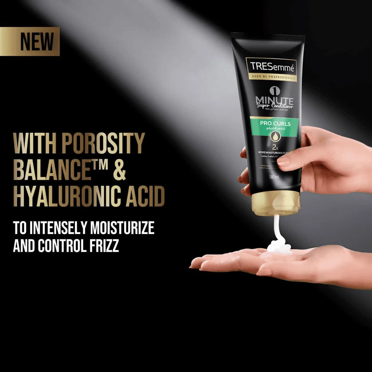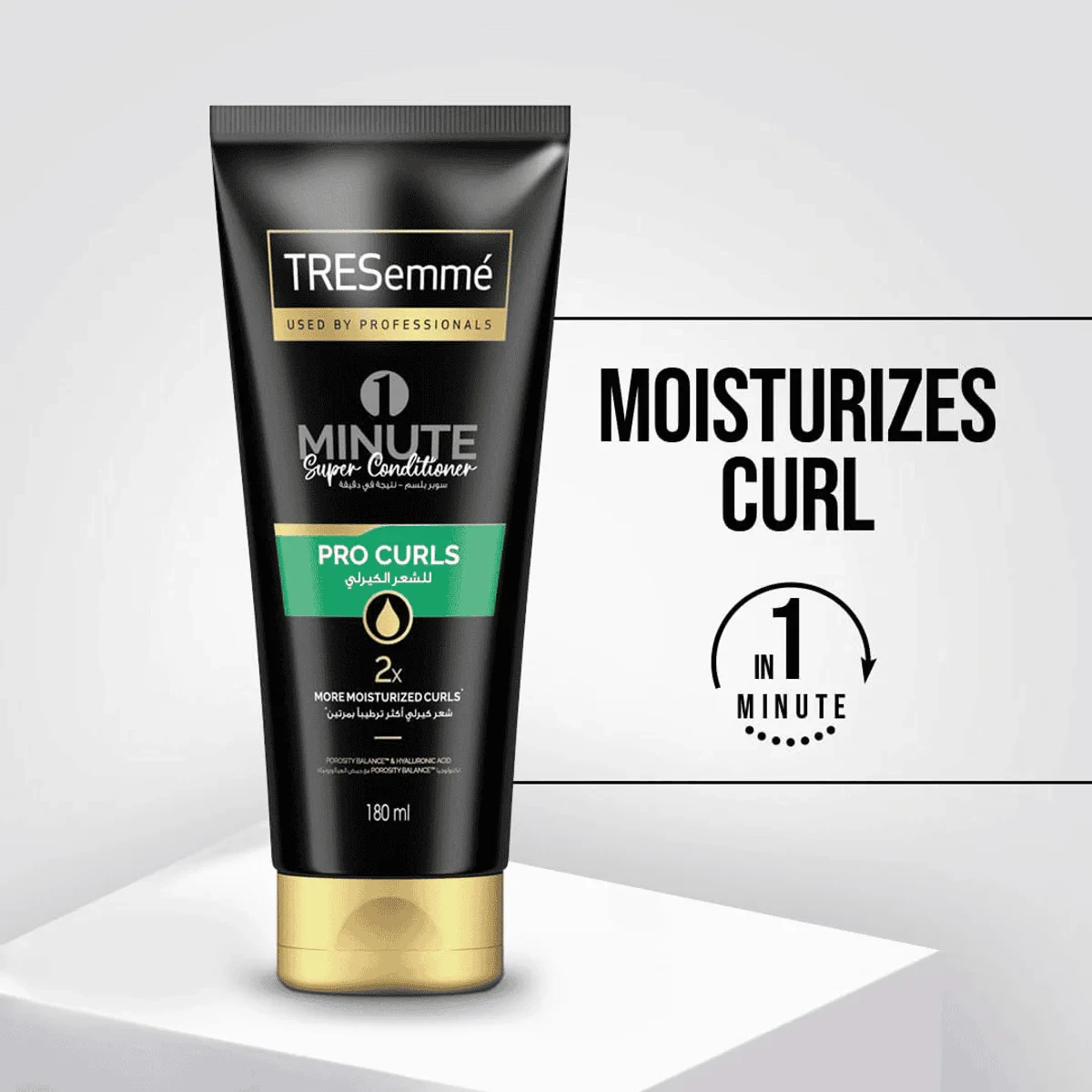 TRESemmé Pro Curls 1 Minute Super Conditioner hydrates and defines curls with Porosity Balance and Hyaluronic Acid. Ideal for dry, curly hair. Features
