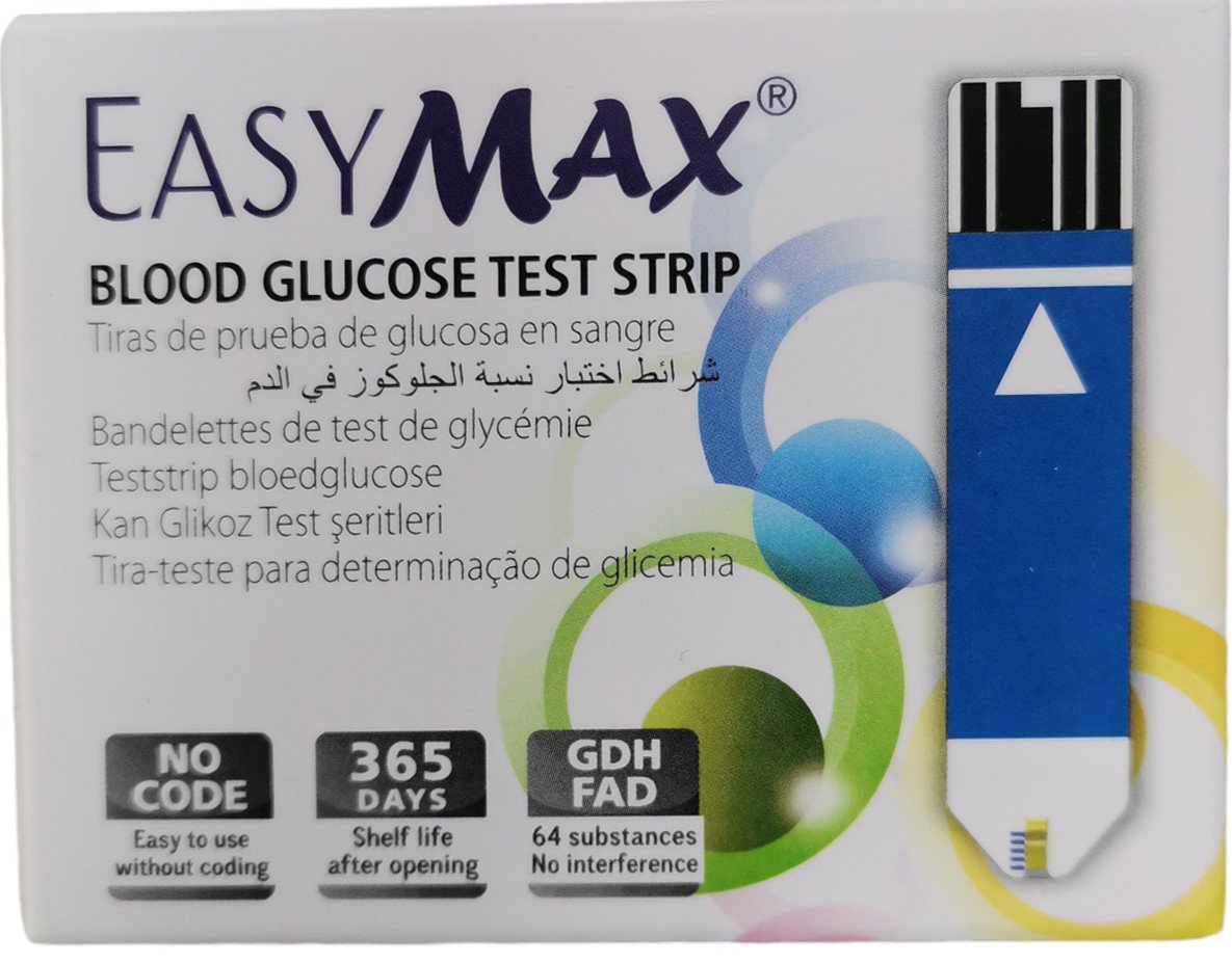 شرائط ايزي ماكس تستخدم للاختبار قياس نسبة الجلوكوز في الدم في المنزل.