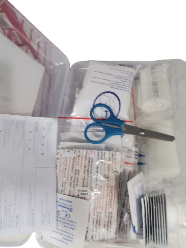 تحتوي على عناصر أساسية مثل ضمادات الكحول، ومناديل المياه المالحة، ومعقم اليدين، ومقياسين، ومنصات الصيدلة، ومقص، وزوج من القفازات، وضمادة مثلثة.