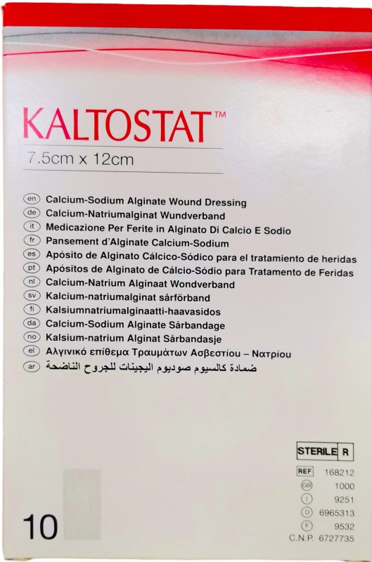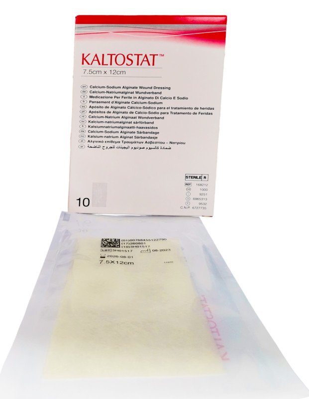 ضمادات كالتوستات ألجينات مقاس 7.5*12 سم تستخدم كضمادة أولية للجروح المزمنة والحادة ذات الإفرازات المتوسطة إلى العالية، وللجروح التي تعاني من نزيف بسيط.