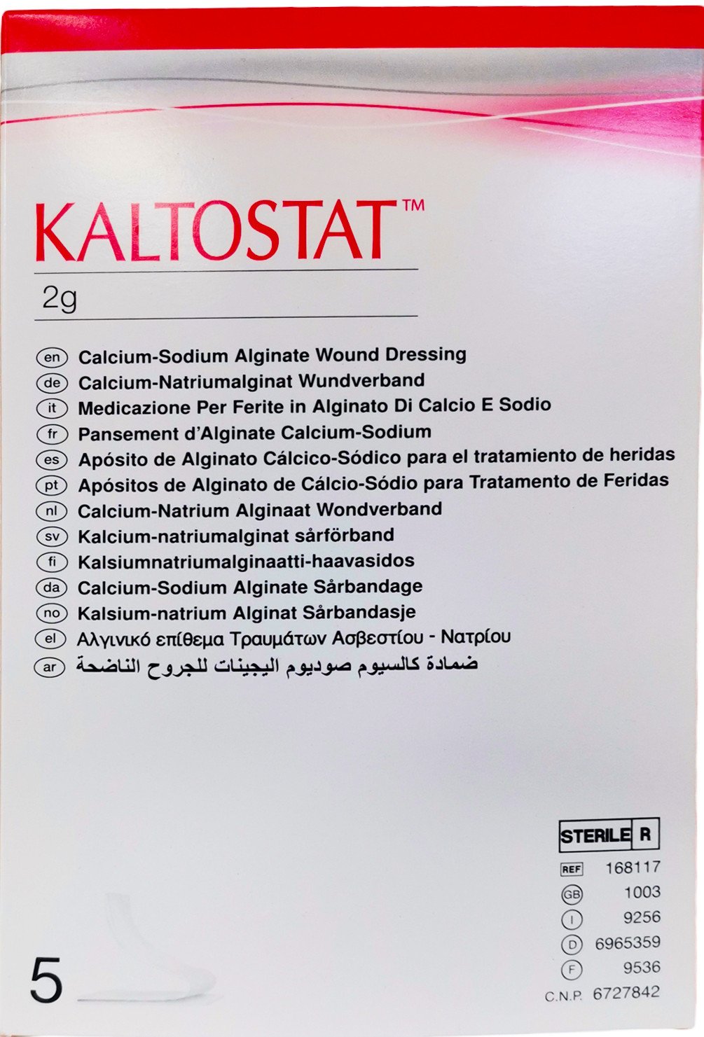 كالتوستات حبل الكالسيوم 2 جرام ألجينات صوديوم الكالسيوم الماصة (80% كالسيوم و20% صوديوم) مع نسبة عالية من حمض الجولورونيك. عند ملامسة إفرازات الجرح، تتواجد أيونات الكالسيوم في الضمادة ويتبادل مع أيونات الصوديوم الموجودة في الإفرازات مما يؤدي إلى تحول الضمادة من جافة ليفية.