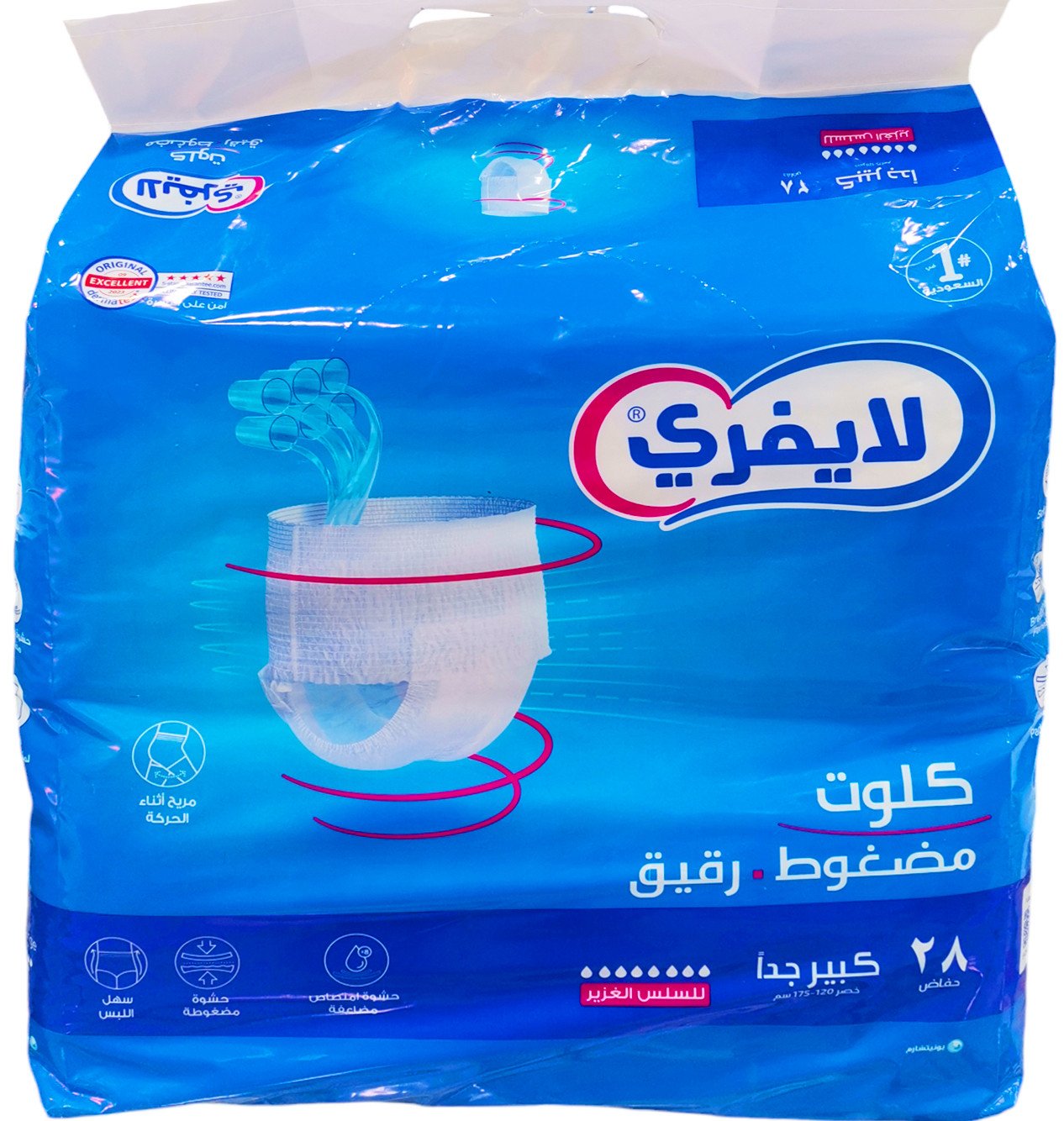 ليفري كِلوت رقيق حفاضات لكبار السن تتميز بالمرونة العالية والامتصاص والنعومة لراحة كبار السن بنسبة 100 %وتمتص حتى 3 أكواب من الماء بدون تسرب.
