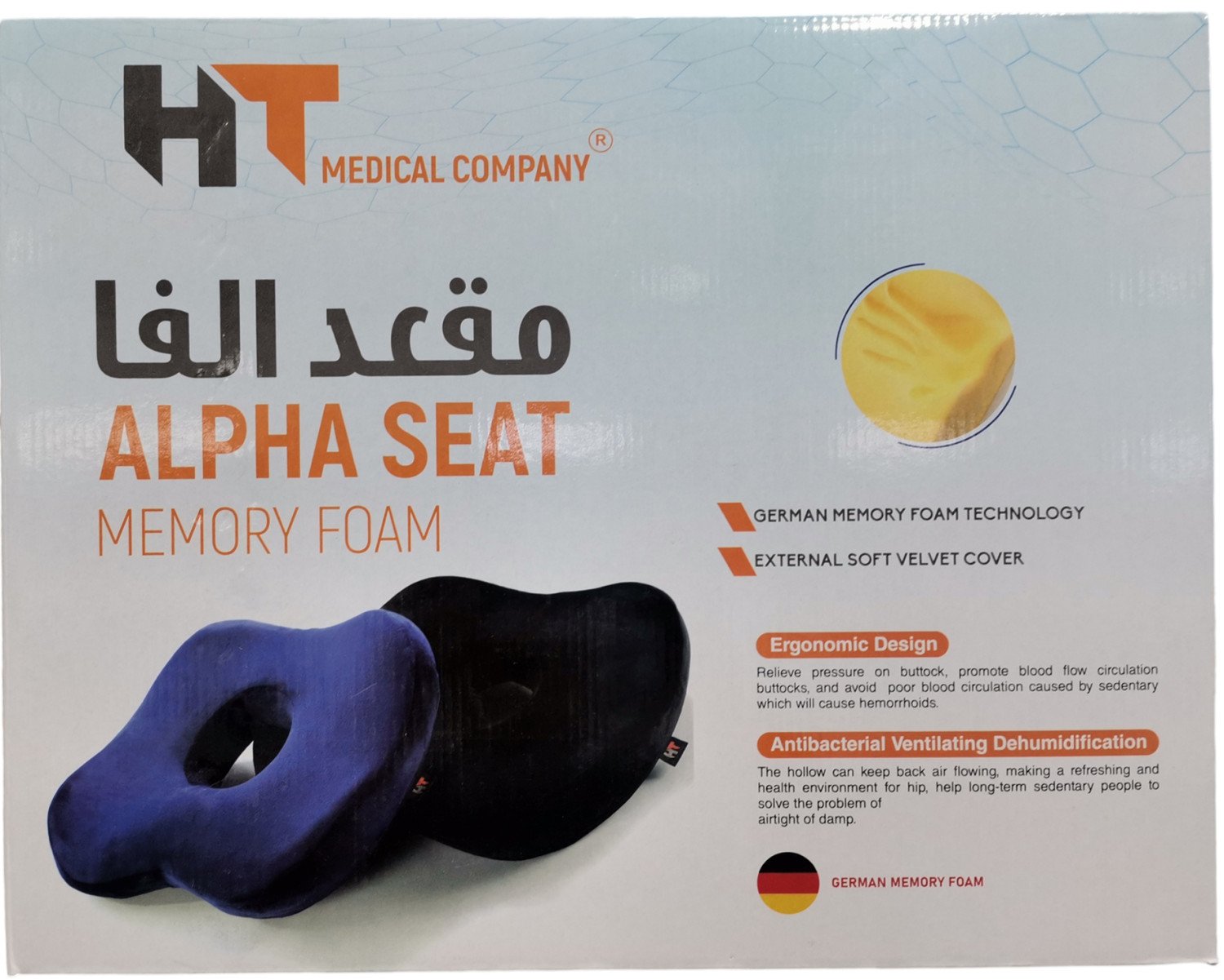 المقعد مصمم بشكل مطور بحيث يعمل على الوقاية من آلام البواسير والعصعص ويتميز شكله المطور بعمل تهوية من كافة الجوانب مما يمكنك من الجلوس لفترات طويلة.